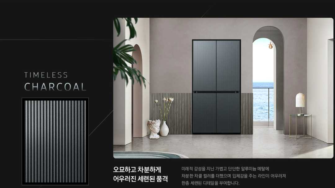 비스포크 냉장고 인피니티 라인은 압도적 고급감의 알루미늄 감성 메탈에 영원한 아름다운의 근원인 대자연의 질감을 담은 편안함과 무게감으로 시간이 흘러도 변하지 않는 디자인을 완성해줍니다.